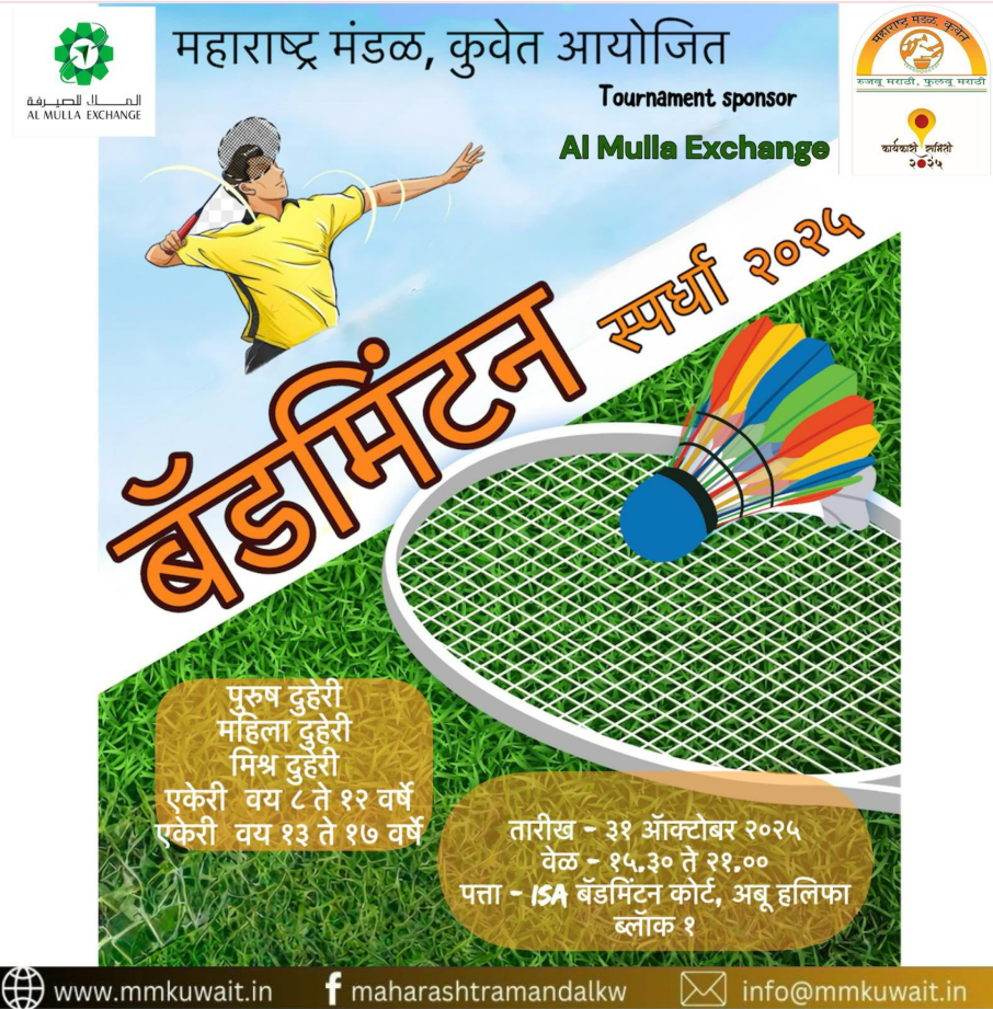 शुक्रवार, दिनांक ३१ ऑक्टोबर २०२५ रोजी महाराष्ट्र मंडळ, कुवेत यांच्या वतीने बॅडमिंटन स्पर्धेचे आयोजन करण्यात आले.