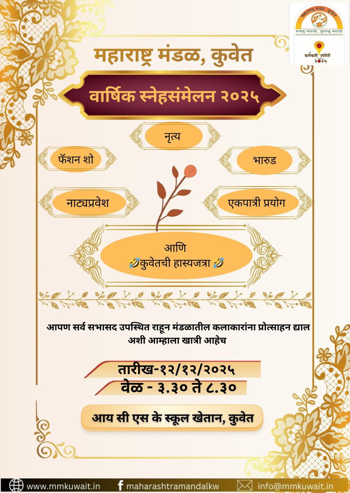 दि. ०२.०५.२०२५ रोजी महाराष्ट्र मंडळ कुवेततर्फे महाराष्ट्र दिन उत्साहात साजरा करण्यात आला. "महाराष्ट्राची संस्कृती दर्शन" या कार्यक्रमात महिलांनी विविध नृत्य सादर केली. पाहुणे कलाकार म्हणून श्री. ऋषिकेश जोशी यांनी आपल्या सादरीकरणाने कार्यक्रमात रंगत आणली.